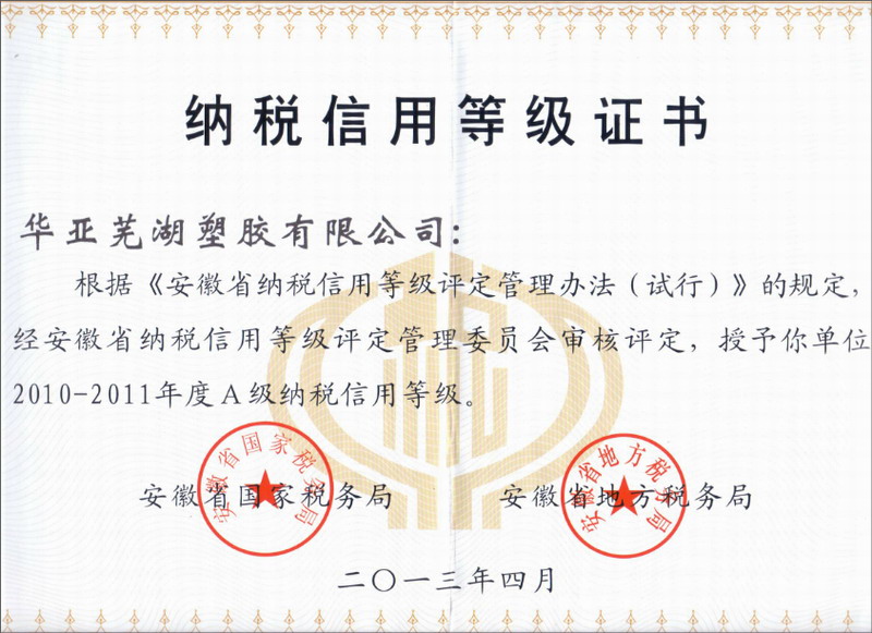 A级纳税信用等级证书(塑胶2010-2011年度)
